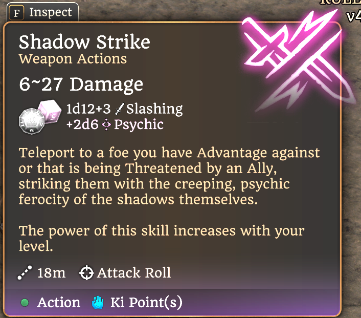 - 重制的暗影打击:现在它增加了+2d6心灵伤害,并消耗1点气力。射程增加到18米。每提升两个角色等级,伤害会相应增加(5级为+3d6,7级为+4d6等)。不再需要潜行或隐藏在敌人视线之外,而是要求玩家对目标有优势或者目标被盟友威胁。