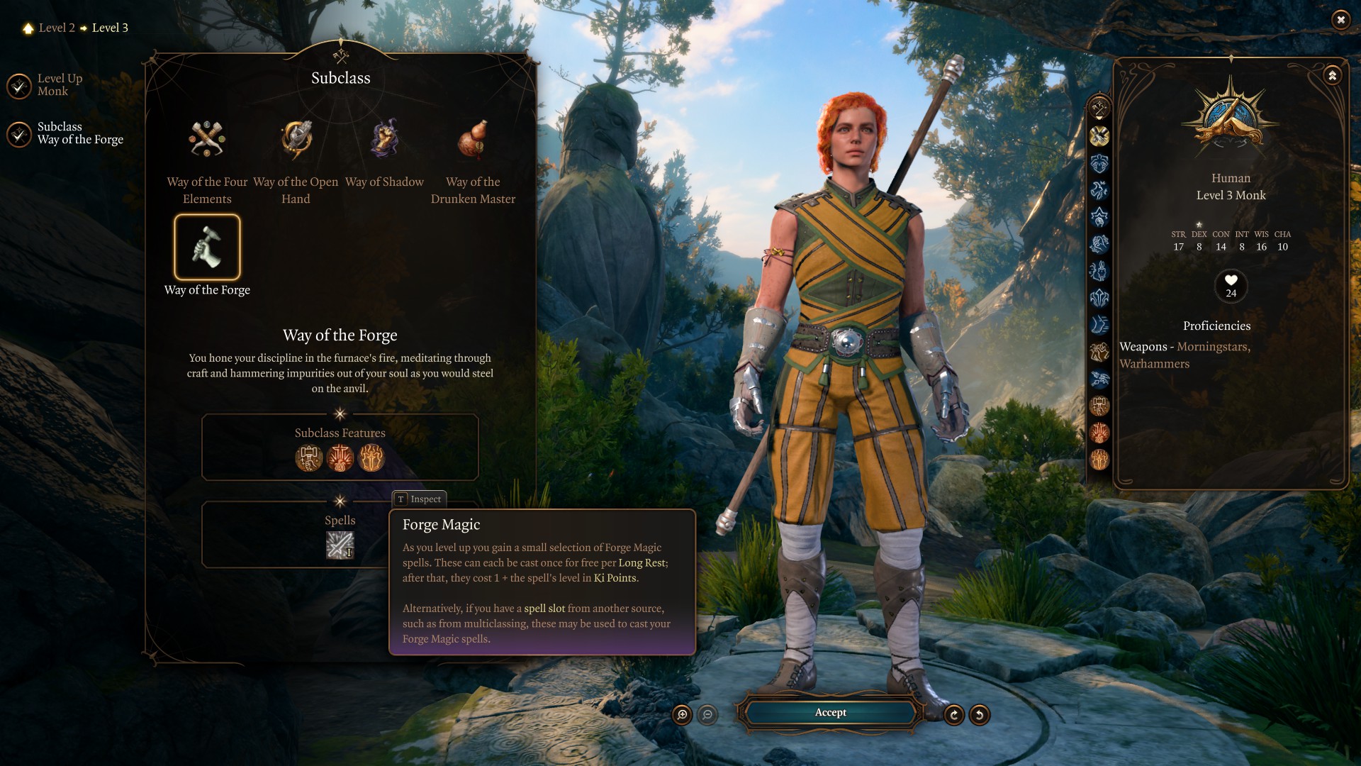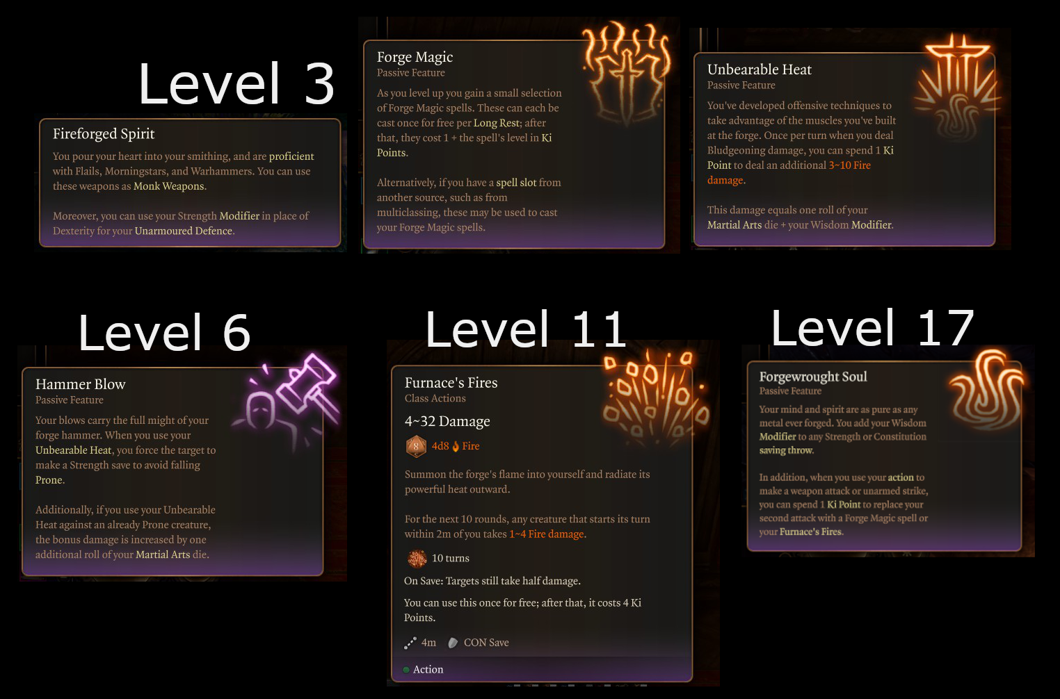 这是 somanyrobots 的 锻造之道 的改编版本,一个使用战锤的武僧,将钝击伤害与金属魔法和火术结合在一起。整天在铁匠铺工作,你希望专注于力量而非敏捷,因为这个肌肉发达的武僧需要如此。用热量对付敌人,并利用有限的锻造魔法来增强盟友的武器和防御。