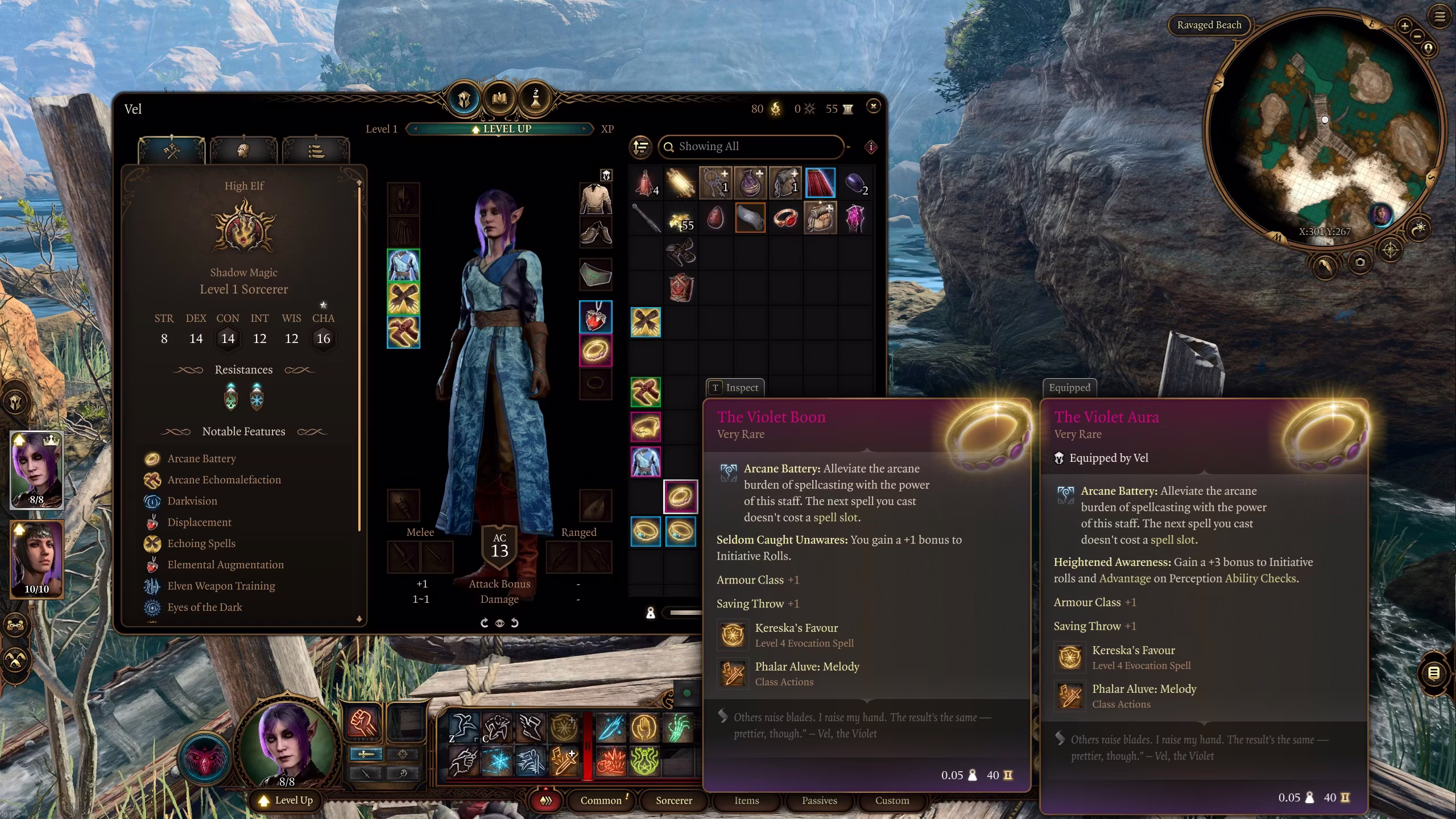 为了增加趣味性。Vel 是一个收藏家和附魔师,这就是我不使用武器的理由。她只是寻找带有漂亮附魔的酷炫物品,并将它们转移到她的护甲上。这也是她访问班德尔城的原因 ^^. 为了平衡角色,我打算进行双人通关(她和 Shadowheart)。即使如此,仍然没有一个防护术法师强大 – 您可以完全不使用任何物品就通过游戏 >.<