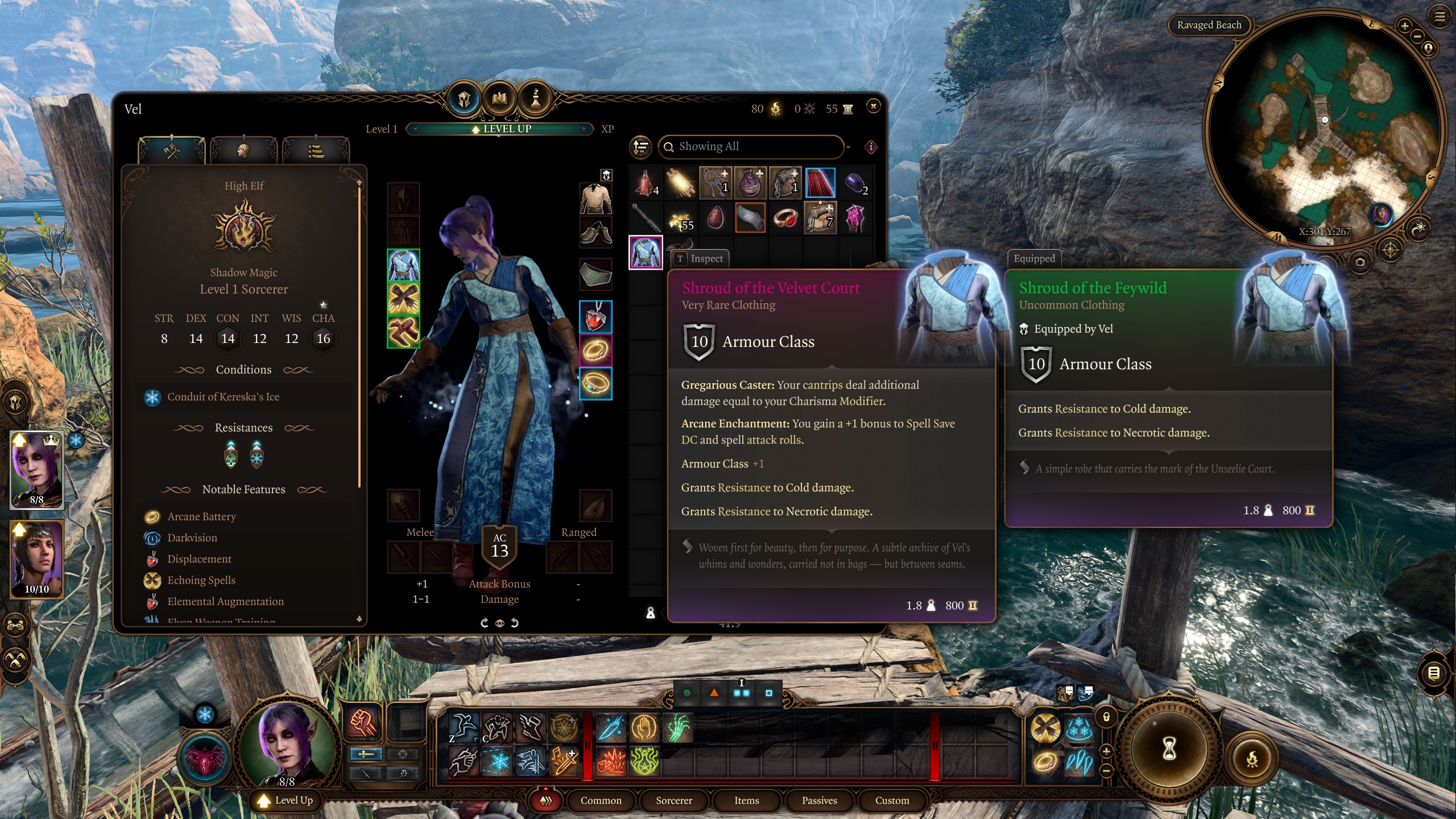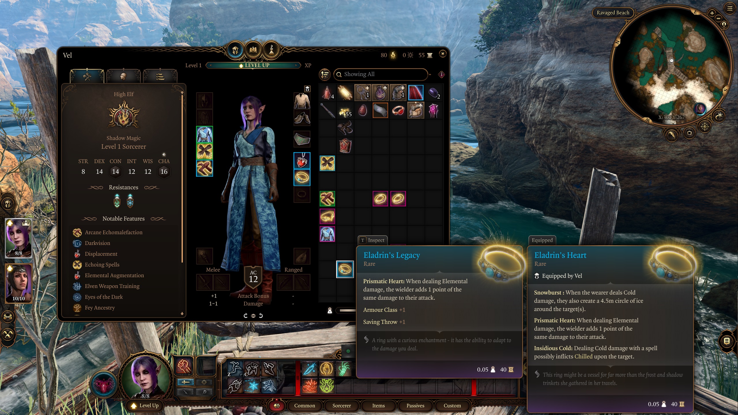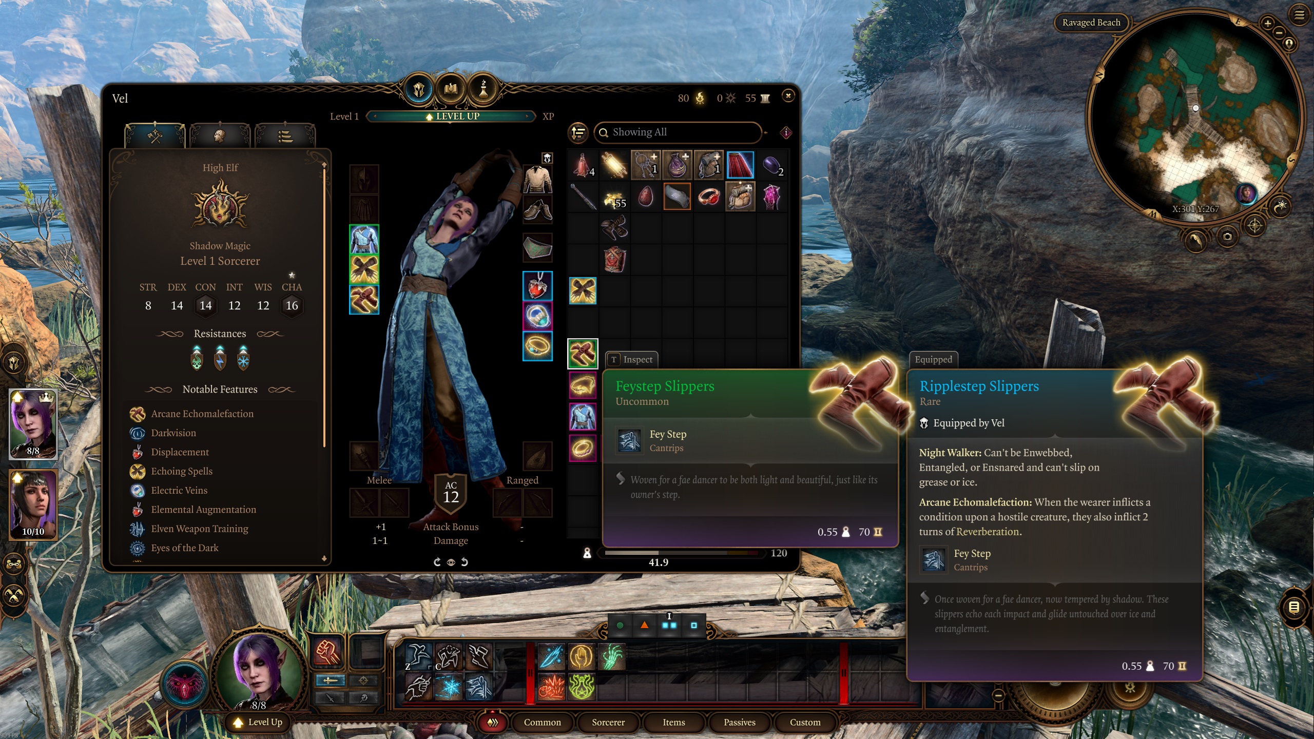 为了增加趣味性。Vel 是一个收藏家和附魔师,这就是我不使用武器的理由。她只是寻找带有漂亮附魔的酷炫物品,并将它们转移到她的护甲上。这也是她访问班德尔城的原因 ^^. 为了平衡角色,我打算进行双人通关(她和 Shadowheart)。即使如此,仍然没有一个防护术法师强大 – 您可以完全不使用任何物品就通过游戏 >.<