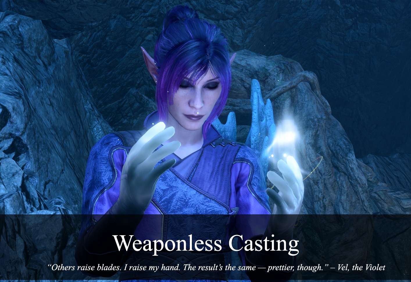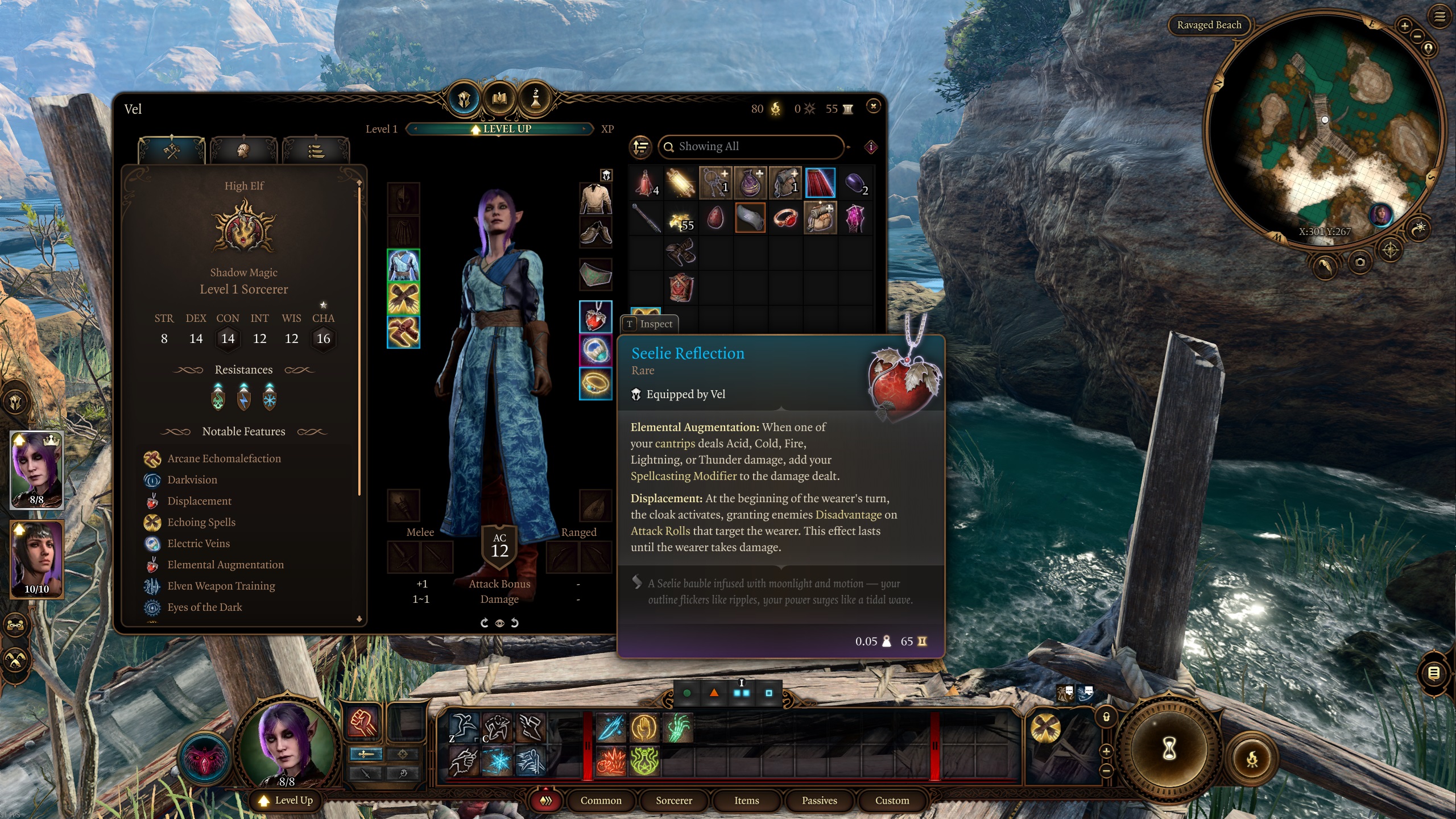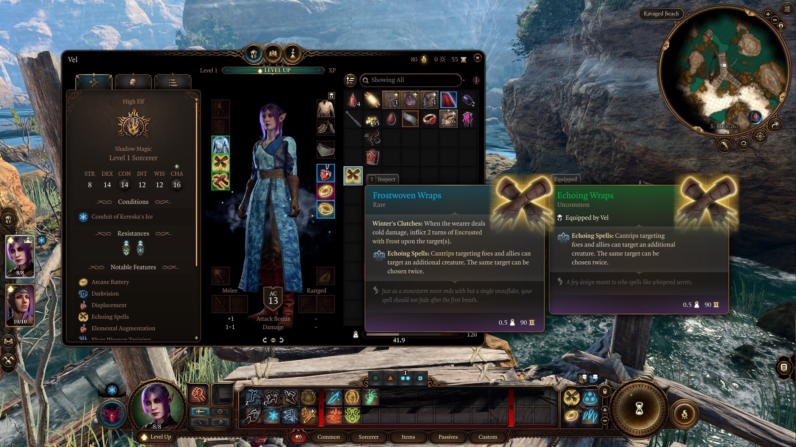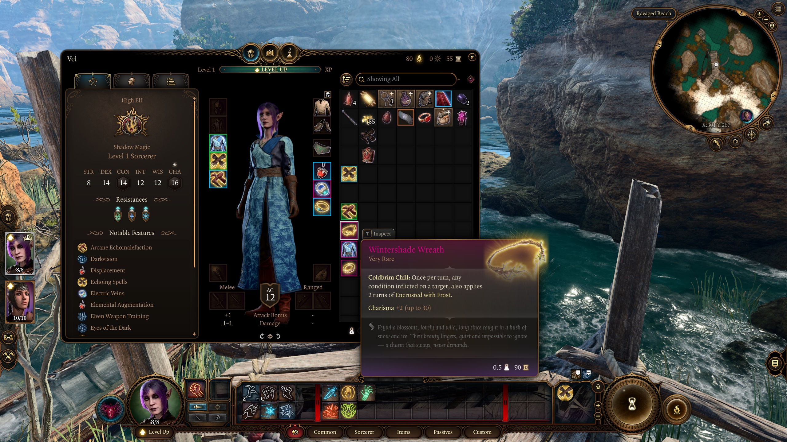为了增加趣味性。Vel 是一个收藏家和附魔师,这就是我不使用武器的理由。她只是寻找带有漂亮附魔的酷炫物品,并将它们转移到她的护甲上。这也是她访问班德尔城的原因 ^^. 为了平衡角色,我打算进行双人通关(她和 Shadowheart)。即使如此,仍然没有一个防护术法师强大 – 您可以完全不使用任何物品就通过游戏 >.<