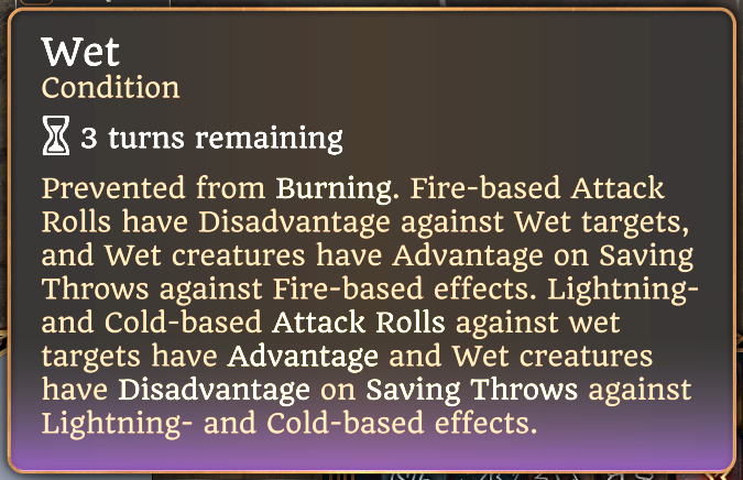 - 当目标处于湿状态时,在闪电或寒冷效果下的豁免检定中具有劣势。