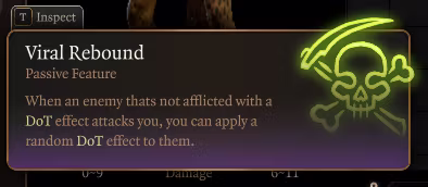 病毒反弹:当未受持续伤害影响的敌人攻击你时,你可以对其施加一个随机的持续伤害效果。