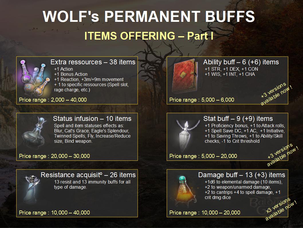 - 宝箱 1 – 可叠加增益:+1/+3 属性提升(力量、敏捷等, 防御等级、精通加成、攻击掷骰、生命值、先攻、跳跃距离…), 伤害提升(+X到武器/徒手/法术伤害,+1d10到元素伤害),治疗提升, 额外投射物(如魔法飞弹、异界之焰等)。