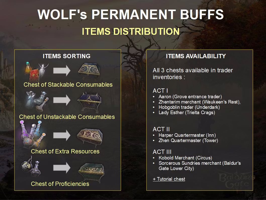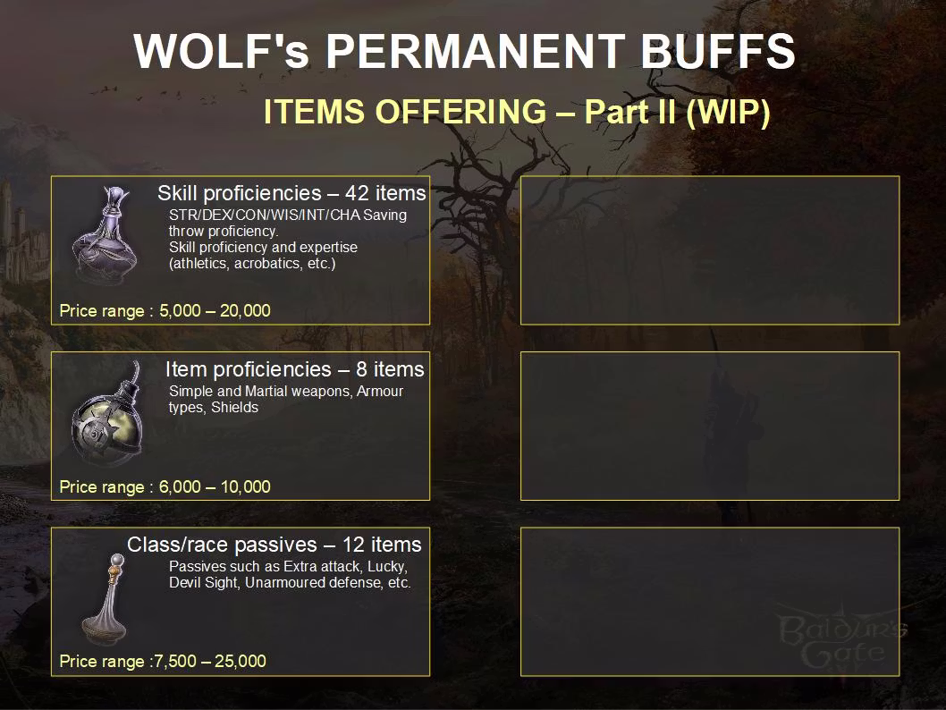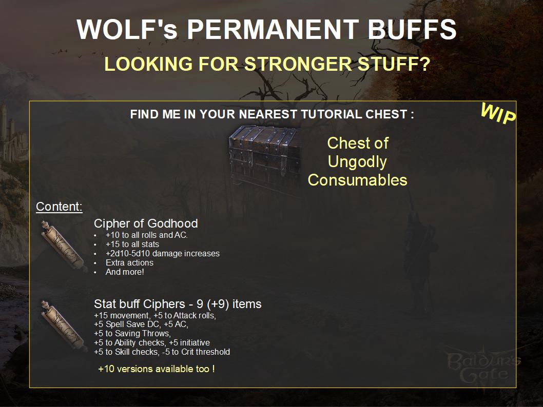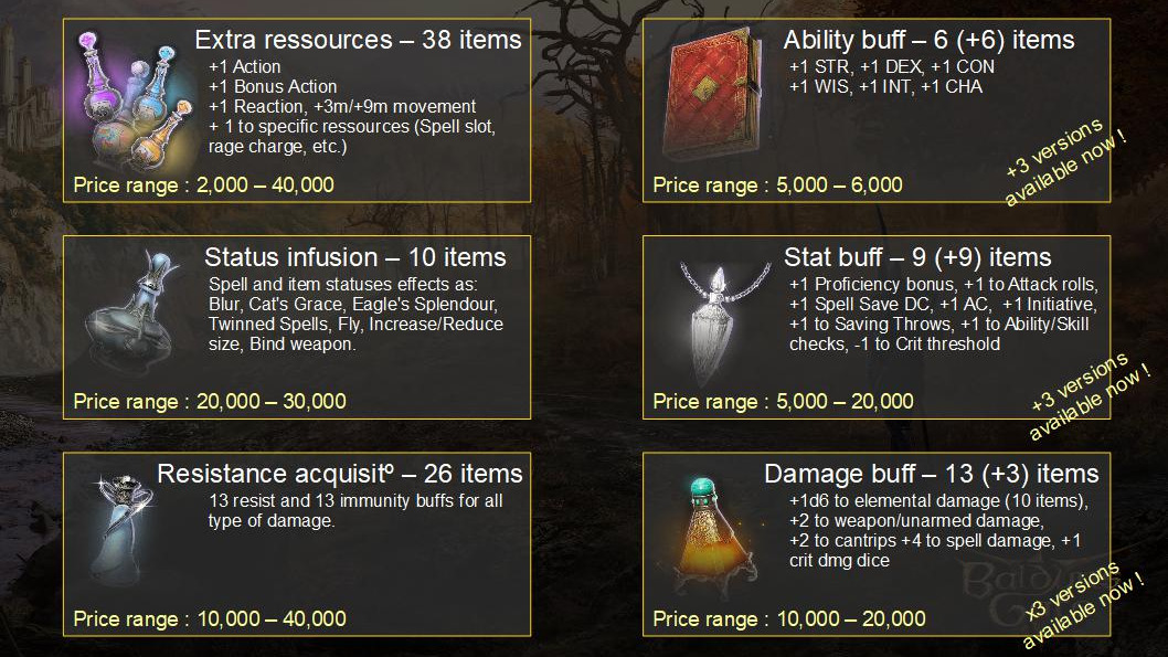 此模组实现了超过200种消耗品,包括《BG1和BG2》中的属性之书,以获得永久提升角色的能力、技能、被动能力、抗性以及额外资源(如法术槽位、狂暴充能等),还有精通、法术等等。