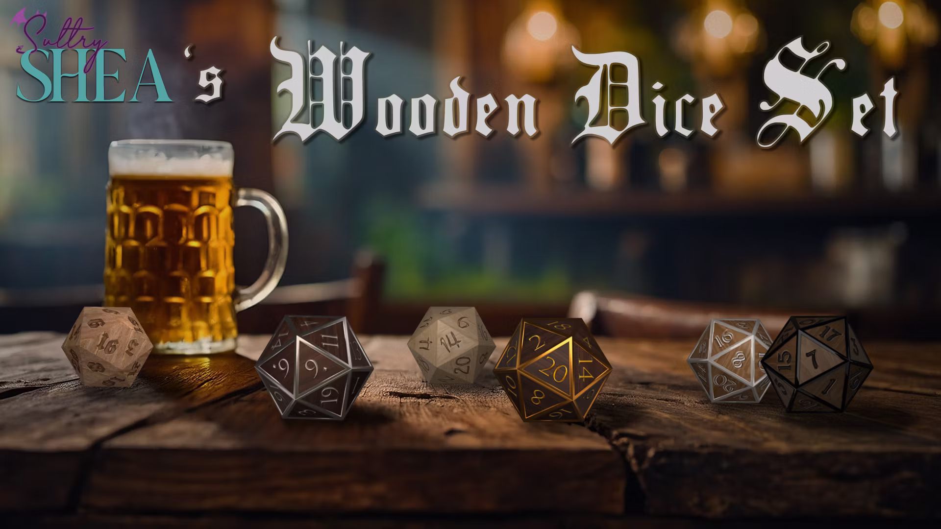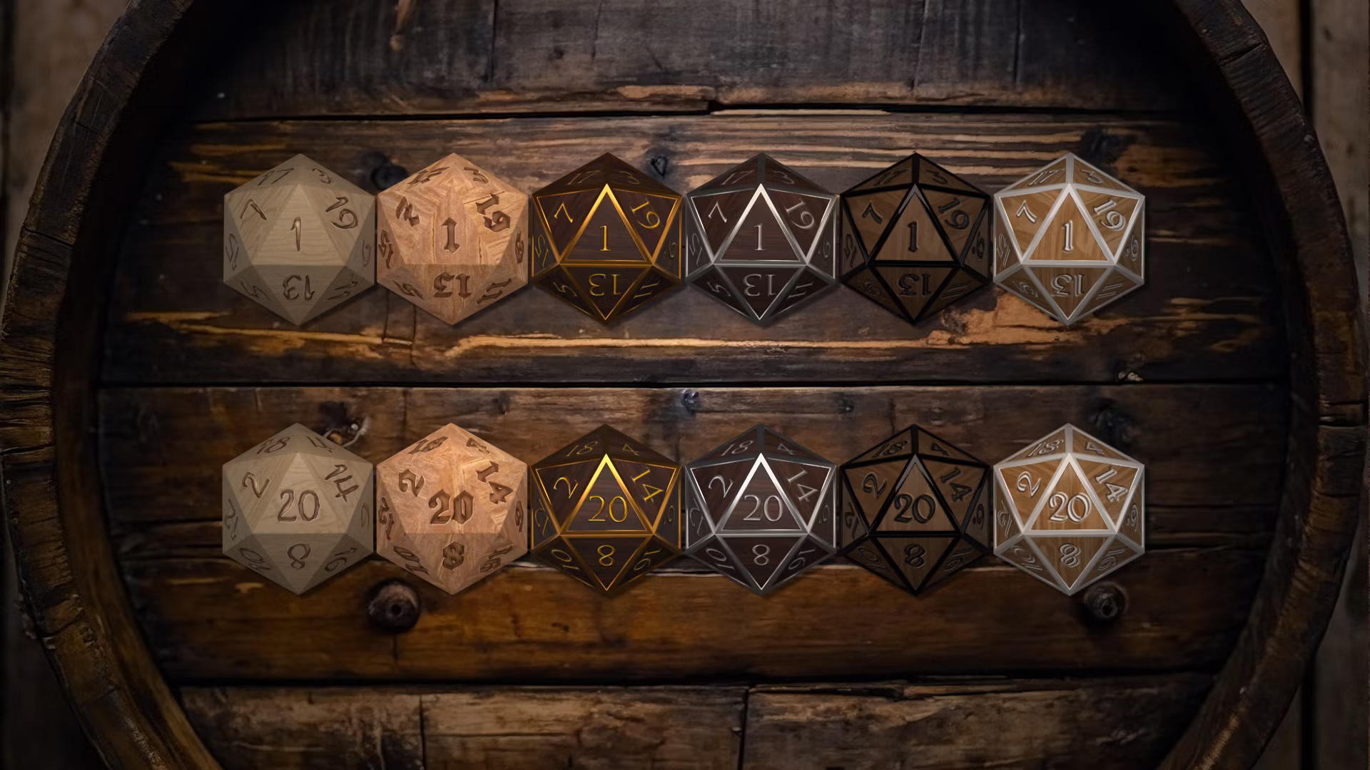 一套包含六种不同木质骰子的收藏,为您的装备增添更多选择。这六种类型包括:酒馆骰子、旧英文骰子、金色胡桃木骰子、银色胡桃木骰子、深色浮雕骰子和浅色浮雕骰子。